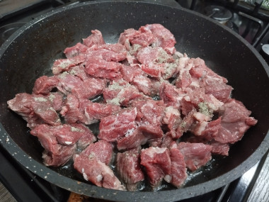 В сковороде разогрейте растительное масло. О том, как подобрать идеальную сковороду, а также как правильно выбрать растительное масло, читайте в отдельных статьях, ссылки в конце рецепта. Выложите на сковороду кусочки говядины, посыпьте смесью соли, сахара и перца и перемешайте.