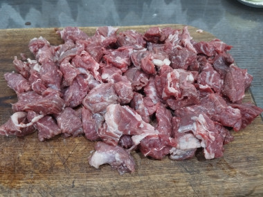 Говядину вымойте, обсушите и нарежьте средними кусочками.