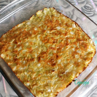 Какую форму использовать лучше всего? Подойдет любая жаропрочная форма. Если используете силиконовую форму промазывать ее маслом или маргарином не нужно. Достаточно не вытирать ее после того, как она была промыта водой. А вот металлическую, керамическую или стеклянную посуду лучше слегка смазать растительным маслом, чтобы пирог не пригорел. Можно взять небольшие порционные формы (на треть теста) и испечь три пирога. Первой на дно формы выложите капусту.