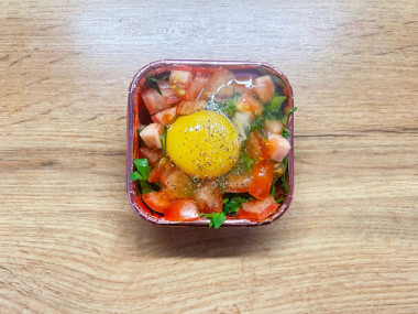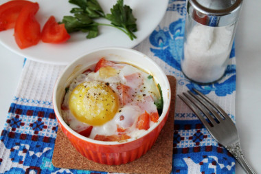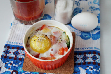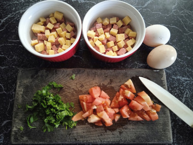 Готовила сразу две порции. Вместо ветчины использовала полукопченую колбасу. Нарезала кубиками твердый сыр и колбасу, сложила в смазанные кокотницы. Нарезала помидор и петрушку. Тоже положила в кокотницы. Разбила по яйцу сверху на остальные ингредиенты в каждую кокотницу. Посолила и поперчила. Готовила 20 минут при 180 градусах в духовке.