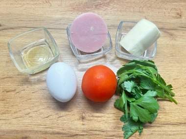 Формочку для выпечки (кокотницу) смажьте маслом. С выбором формы для запекания поможет статья по ссылке в конце рецепта. Выложите в неё слоями друг за другом колбасу, сыр, петрушку, помидор. Отправьте формочку в разогретую до 200 градусов духовку на 10-15 минут. За это время начинка немного осядет.