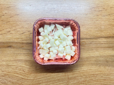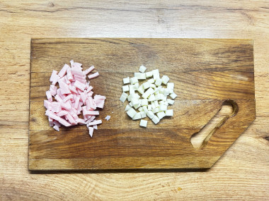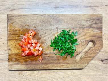 Сыр подойдет любой по вкусу, который хорошо плавится. Колбасу можно заменить на балык, ветчину и т.д. Я делала двойную порцию. Включите духовку на 200 градусов. Помидор и петрушку помойте и обсушите. При желании можно предварительно снять с помидора кожицу. Как это правильно сделать читайте в конце рецепта. Нарежьте помидор, сыр и колбасу небольшими брусочками. Петрушку (или любую другую зелень по вкусу) измельчите ножом.