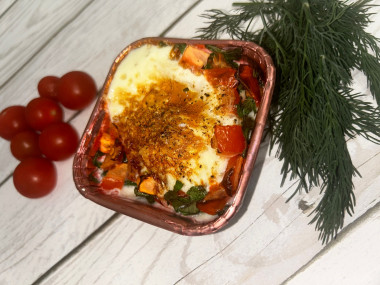 У меня нет кокотниц, зато есть одноразовые формочки для запекания. Удобство в том, что поел-выкинул-забыл) Делала все в соответствии с рецептом. На мой вкус я бы заменила петрушку на зеленый лук. Сочетание было бы выигрышнее. Но даже так мне всё очень понравилось. Сыр расплавился(я брала сулугуни), помидоры дали сочность. Жидкий желток все это дружно соединил вместе с ветчиной;)