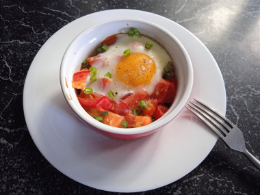 Очень быстрое и простое приготовление. Завтрак удался на славу. Очень сытно, красиво и вкусно. Сыр расплавился, яйцо и овощи с колбасой хорошо пропеклись, желток остался жидким, помидоры дали сочности блюду. Подавать завтрак на стол в кокотницах очень оригинально и необычно. Перед подачей украсила зелёным луком. Яйца кокот нам очень понравились. Большое спасибо автору!