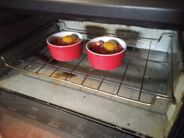 Разбейте сверху яйцо. Немного посолите, поперчите. Верните формочку в духовку ещё на 10-12 минут. Точное время приготовления будет зависеть от особенностей работы вашей духовки. Подробнее об этом читайте в конце рецепта.