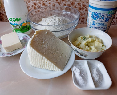 Калорийность продуктов: Пшеничная мука, Кефир, Сода, Соль, Картошка, Адыгейский сыр, Сметана, Сливочное масло