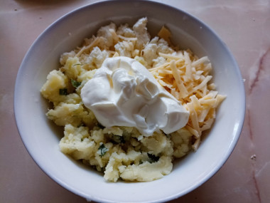 Добавьте к размятой картошке натертый сыр и сметану. Немного посолите. Учитывайте, что в начинке будет уже достаточно соленый сыр, особенно если это брынза. Вы также можете положить в начинку любую зелень по вкусу. Я решила не добавлять.