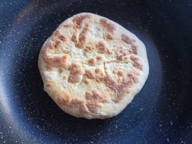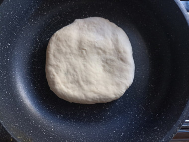 Поставьте на средний огонь сковороду. Ничем не смазывая ее, разогрейте сковороду до горячего состояния. Выложите на нее заготовку лепешки.