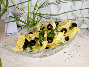Прекрасный легкий салат огурцы оливки! Мне понравилась идея порвать листочки пекинской капусты руками, а не резать как обычно. Получились воздушные, нежные лепесточки! Добавила к ним нарезанный свежий огурчик, ароматную петрушку, зеленый лук для остроты. Добавление оливок смутило, но мужу понравилось такое сочетание) А заправка просто вкуснейшая, обожаю такое сочетание, правда лайма у меня не было, добавила лимонный сок. Салат очень легкий и на вид и для усвоения. Я подавала его к ужину, прекрасное витаминное дополнение!
