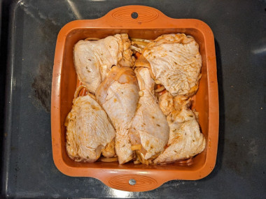 Курицу разделала на порционные кусочки, помыла их в воде, высушила. Мясо положила в глубокое блюдо, добавила соль и специи, перемешала. Некоторые специи содержат соль, поэтому, солить нужно, осторожно.