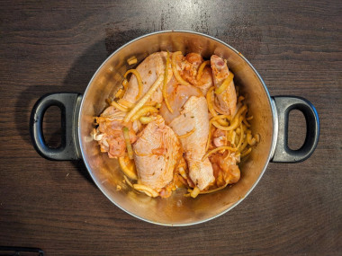Репчатый лук почистила, нарезала полукольцами и поместила к курице. Затем добавила яблочный уксус. Всё тщательно, перемешала. Особенно, нужно уделить внимание луку, чтобы выделил свой ароматный сок, т.к. мясо и лук - хорошие "друзья".
