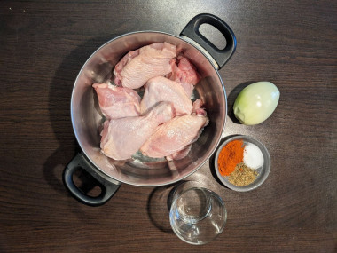 1. Курицу моем, обсушиваем, снимаем кожу, затем рубим тушку на крупные кусочки.