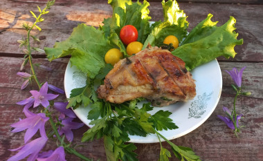 Мясо, оставила мариноваться, почти на сутки. Готовилось на мангале до появления аппетитного румянца и исчезновения крови, главное не передержать.