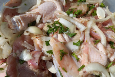 Решили сделать шашлык из курицы. Осталось дело за выбором маринада. Курица, лук, уксус - прекрасный выбор!