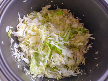 Выберите на вашей модели мультиварки подходящий режим для жарки. У меня это "Выпечка". Выставите время, если можно, то 10 минут, у меня минимальное 20 минут. Налейте в чашу мультиварки растительное масло. Немного разогрейте его. Выложите лук, обжарьте его до прозрачности, помешивая. Затем положите капусту, перемешайте. Жарьте капусту до окончания программы "выпечка". Затем закройте крышку и поставьте программу "Тушение" на 15 минут.