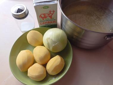 Разнообразь свое меню вкусным сливочным супом! . Сливочный суп-пюре можно готовить из абсолютно разных овощей, в данном рецепте это картошка и лук, но по желанию состав можно корректировать. Сливки в составе делают вкус готового блюда более нежным и шелковистым.
