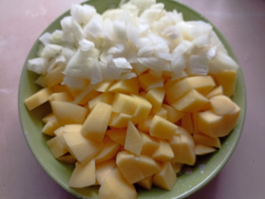 2. Лук моем, режем кубиками, выкладываем в картошке.