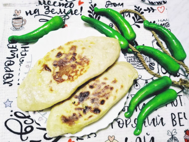 Тесто получилось мягкое и нежное, хорошо раскатывалось на присыпанном мукой столе. Творог у меня был обезжиренный, пастообразный, начинка вышла немного жидкая, но после обжаривании лепёшек стала нормальной. Я решила поэкспериментировать и добавила в творог болгарский зелёный перец вместо зелени и сушёный чеснок. Сочетание солёного творога и чеснока - это просто песня! Перчик также приятно ощущался. С зеленью тоже получается очень вкусно, знаю, потому что пробовала. Тесто после обжаривания похоже на вкусный лаваш. Чеченские лепешки особенно хороши в тёплом виде. Надо присмотреться к блюдам чеченской кухни, не знала что у них готовят потрясающе вкусные лепёшки.