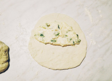 Каждую часть раскатайте тонким слоем в лепешку. Выложите часть начинки и распределите её на половине лепешки, не доходя до краев.
