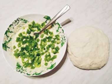 В это время займитесь приготовлением начинки. Зелень вымойте, обсушите и мелко нарежьте. В чашу выложите творог, добавьте к нему мелко нарезанную зелень. Вбейте яйцо. По вкусу подсыпьте соль и специи. Все смешайте. Яйцо предварительно вымойте с чистящим средством для пищевых продуктов.