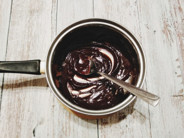 6. А тем временем подготовим глазурь: в кастрюлю насыпаем сахар и какао-порошок, добавляем сметану, все тщательно перемешиваем и отправляем на огонь. Доводим массу до кипения, убираем с плиты.