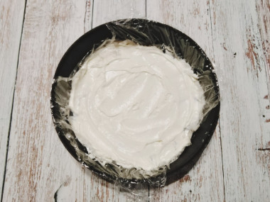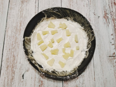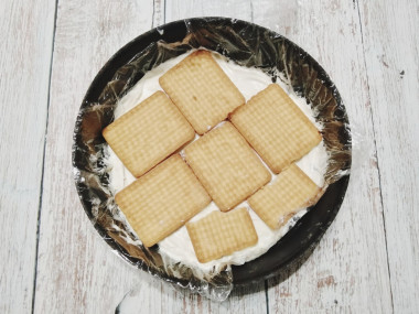 4. Форму выстилаем пищевой пленкой, слегка смазываем кремом, печенье макаем в персиковый сироп, выкладываем первый слой, смазываем творожным кремом и выкладываем персики.