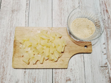 3. Персики отделяем от сиропа, нарезаем кубиками, пару кусочков оставляем для украшения. Также оставляем одно печенье, превращаем его в мелкую крошку для посыпки торта.