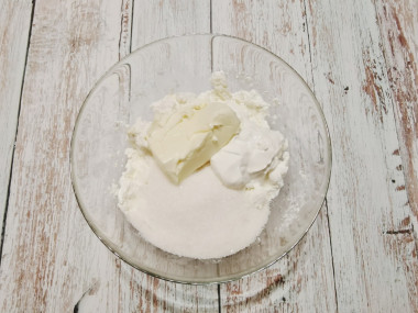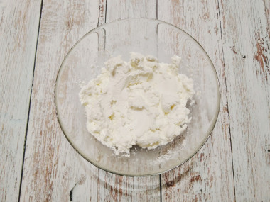 1. Творог выкладываем в миску, с помощью блендера превращаем его в пастообразную массу.