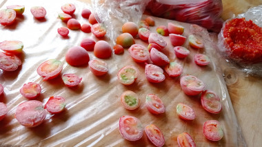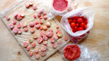 Чтобы процесс был удобнее, а вы сумели сделать несколько разных заготовок, запаситесь, кроме помидоров, острым ножом (лучше с насечками на лезвии) и кухонной доской, мясорубкой или блендером (для перемалывания томатов), тарой, необходимой для заморозки (пластиковые контейнеры, герметичные полиэтиленовые пакеты, формы для выпечки, льда и т.д.), миской и кастрюлькой (для мытья плодов), дуршлагом и бумажными полотенцами, подносом или широким блюдом (для раскладывания кусочков), фольгой или пергаментом (чтобы раскладывать на них кусочки для заморозки), чем-то для размещения заготовок в морозилке.