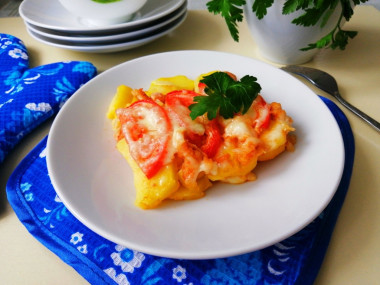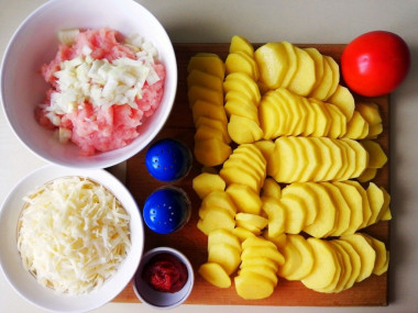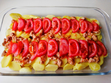 Выкладывала слоями картошку, фарш, натертый сыр. У меня получилось два слоя. Сверху выложила нарезанные помидоры и сыр.