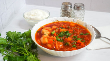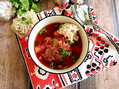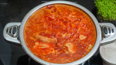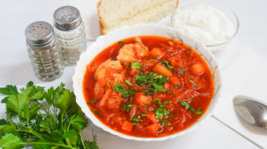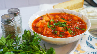 В выходной к обеду собирается вся семья. На первое я решила приготовить классический борщ со свеклой. Мясную составляющую для борща взяла свиные мясные ребра с прослойкой жирка. Первым делом приготовила наваристый бульон из свиных ребер. Далее подготовила, начистила и нашинковала овощи для борща. Морковь люблю резать в борщ кубиками, а свеклу - тереть на крупной терке. На сковороде обжарила и протушила овощи, добавила немного томатной пасты. К бульону добавила картофель, нарезанный кубиками. Когда картофель в бульоне проваривается до готовности, я добавляю нашинкованную капусту и поджарку из овощей. В моей семье любят густой борщ, поэтому картофеля и капусты добавляю немного больше, чем в рецепте. Оставила провариться борщ до готовности капусты, добавила нарезанный чеснок, свежую зелень и специи по вкусу. Борщ получился очень вкусным, наваристым и в меру густым. Спасибо автору за рецепт!