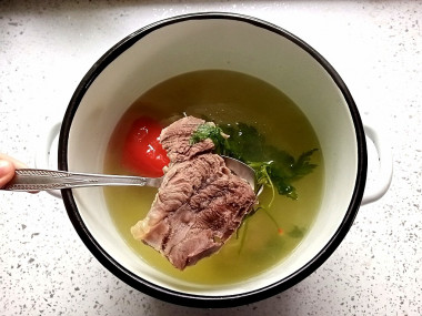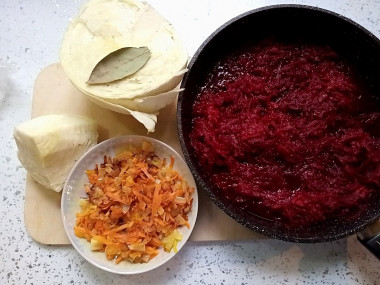 Я тоже варила бульон из говядины на косточке, только первый бульон довела до кипения и слила. Во второй бульон положила пару веточек петрушки и сладкий перчик для вкуса. Варила примерно два часа, чтобы мясо стало максимально мягким. Для заправки пожарила лук и морковь до золотистого цвета. А потом на той же сковороде потушила свеклу с протертой помидоркой и томатной пастой. В свеклу добавила яблочный уксус для сохранения цвета и сахар для нейтрализации кислоты. Капуста у меня не молодая, поэтому варила ее одновременно с картошкой. Перчик и лавровый листочек в завершении, как вишенка на торте).