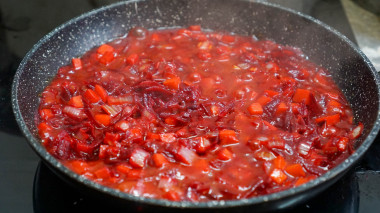 Далее идёт очередь тушеной свёклы. Отправьте её в кастрюлю и после закипания томите под крышкой на слабом огне 5 минут.