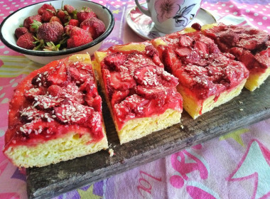 Очень мне понравился дрожжевой пирог с клубникой. Захотелось тоже такой приготовить. Как ни странно, но все продукты были под рукой, за исключением марципана. Решила готовить пирог, заменив марципан на сезам. Процесс приготовления теста не занял много времени. Соединила по рецепту яйца со сливками и сахарным песком. Растопила в микроволновке сливочное масло. Смешала муку, дрожжи, куркуму, цедру апельсина. Муки у меня ушло на 60 грамм больше. Вымесила липкое и мягкое тесто. Пока оно подходило, нарвала свежей клубники, взвесила, помыла, обработала и нарезала пластинками. По совету автора форму застрелила пергаментом и смазала маслом. Использовала квадратную разъемную форму размером 26 см на 26 см. Уложила подошедшее тесто и снова оставила в тепле на пол часа. Выложила поверх теста клубнику, присыпала сахаром и сезамом. Выпекала 30 минут при 180 С. Аромат потрясающий! Чуть остудив пирог, нарезала порционно. Потрясающе нежный и мягкий, очень ароматный и вкусный вышел клубничный пирог на дрожжевом тесте. Начинки достаточное количество, она сладкая. Тесто отлично поднялось, за счёт апельсиновой цедры оно нереально вкусное, воздушное и лёгкое. Кусочки пирога улетали на ура! Мы не могли остановится, все ели с большим удовольствием. Восхитительный дрожжевой пирог с клубникой уже хочется повторить) Особенно понравилась в тесте апельсиновая цедра, она идеально подчеркнула вкус пирога. Всем рекомендую! Очень достойный рецепт! Большое спасибо автору!
