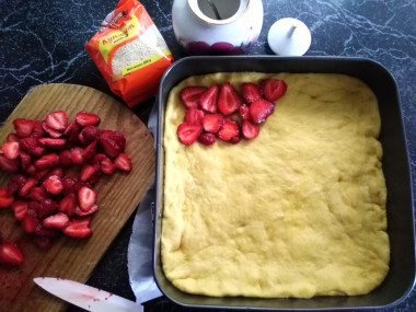 5. Клубнику моем, удаляем плодоножки, нарезаем пластинками, выкладываем на уже подошедшее тесто. Марципан режем мелкими кубиками, посыпаем им клубнику, а сверху посыпаем коричневым сахаром.