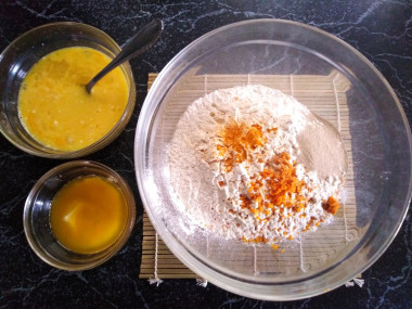2. В отдельную миску просеиваем муку, добавляем сухие быстродействующие дрожжи, куркуму, апельсиновую цедру и растопленное сливочное масло.