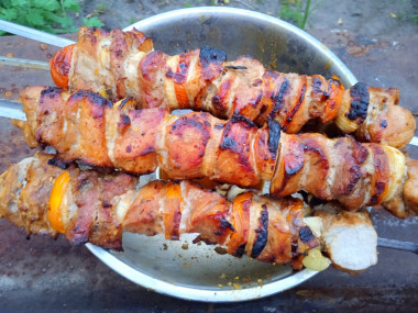 7. Маринованное мясо нанизываем на шампура, жарим на мангале в течение 15-20 минут, не больше, чтобы не пересушить.