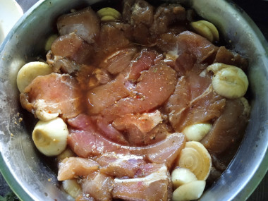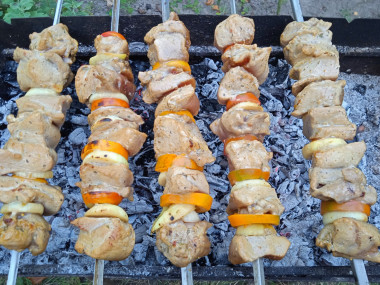 Кто ж не любит мясо на костре?! Большинство очень и даже очень не прочь полакомиться вкусным мяском. Решила делать шашлык по этому рецепту, мне понравился маринад из вина. Но так как мы не едим баранину, я заменила мясо на привычную нам свинину. Мясо порезала на кусочки, оставив жир по совету автора. Он вытопится и придаст мясу сочности. Лук порезала кружочками. Замариновала мясо с луком в белом вине с добавлением молотого кориандра (моя любимая специя), соли, перца и розмарина, зиры под рукой не оказалось. Добавила от себя ещё приправы для гриля. Не было у меня аж 5 часов для маринования, поэтому чтоб мясо быстрее промариновалось я поставила гнёт и оставила при комнатной температуре на 40 минут. Нанизала кусочки мяса, чередуя с луком, на шампура. Также для красоты ещё добавила кружки помидора. Готовила шашлык на мангале на углях минут 20, постоянно прокручивая шампура, до румяности.
