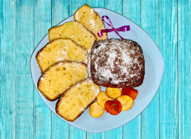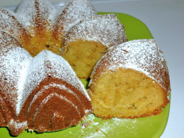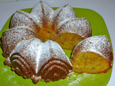 Дайте кексу немного остыть в форме, затем переверните его на плоское блюдо, пока он еще теплый. Когда кекс полностью остынет, посыпьте его сахарной пудрой и подавайте на десерт. Приятного аппетита!