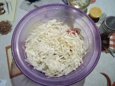 Капусту для салата тонко нашинкуйте и немного помните руками. Для чего мять руками? Это необходимо для того, чтобы она стала мягче и сочнее. От этого и готовый салат будет более сочный.