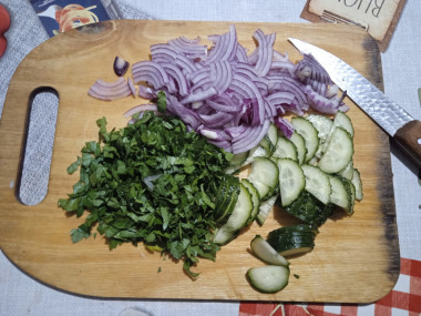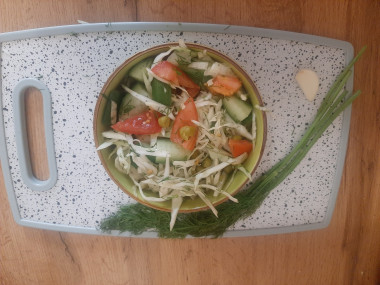 Очень вкусный салат, готовлю так же, только еще редисочку добавляю и зеленый лук.