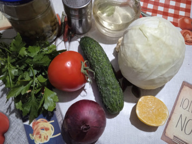 Калорийность продуктов: Капуста белокочанная, Огурцы, Зелёный горошек, Помидоры, Оливковое масло, Лимонный сок, Соль, Зелень