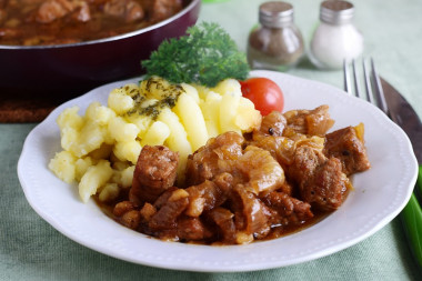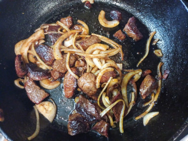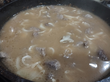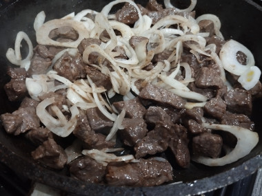 Когда мясо зарумянится, добавьте лук. Перемешайте и жарьте до прозрачности лука. Влейте 1,5 стакана горячей воды, уменьшите огонь, накройте сковороду крышкой и тушите мясо до готовности примерно 30-40 минут.