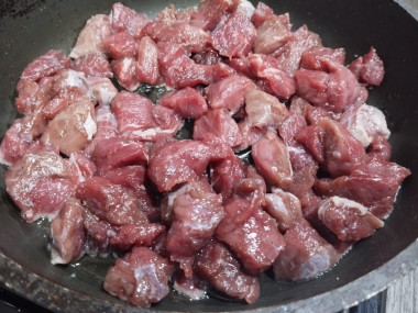 В сковороду влейте растительное масло. Обжарьте мясо на сильном огне в течение примерно 10 минут, периодически перемешивая, чтоб говядина не подгорела. О том, как подобрать идеальную сковороду, а также как правильно выбрать растительное масло, читайте в отдельных статьях, ссылки в конце рецепта.