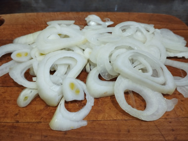 Лук помойте, очистите и нарежьте полукольцами. Ополосните нож холодной водой, это поможет вам избежать раздражения слизистых глаз.