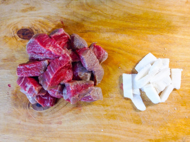 Филе говядины вымойте, промокните бумажным полотенцем. Мясо обязательно следует просушить. Так оно хорошо прожарится, что нам и нужно будет при предварительной обработке. Нарежьте небольшими кусочками, сложите в миску со специями и тщательно перемешайте.