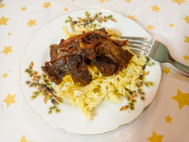 Говядина получилась хорошая. Мясо достаточно поджаристое, сверху образовалась корочка, но внутри мясо мягкое. Вкус у блюда насыщенный, яркий. Подавала говядину с макаронами.