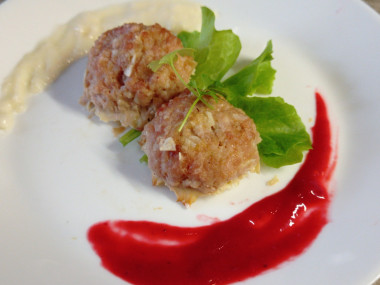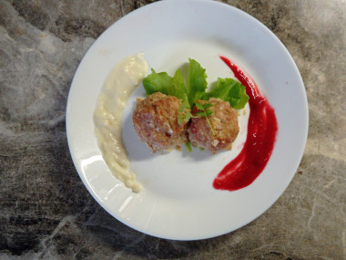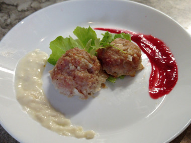 Подаем фрикадельки на стол с молочным и ягодным соусом.
