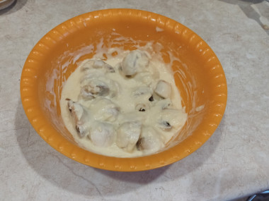 Грибы у меня были среднего размера,я их порезала пополам. Для кляра смешала яйца, муку, майонез, сыр, натёртый на мелкой тёрке. Тесто получилось густое,как на оладьи. Грибы опустила в кляр,перемешала,чтобы кляр полностью покрыл грибы. Обжаривала на сковороде с двух сторон.