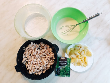 Как сделать пирог на кефире с курицей? Подготовьте продукты. Куриное филе вы можете взять от любой части курицы, у меня филе грудки. Из охлажденного мяса начинка получится сочнее. Замороженное филе предварительно разморозьте. Кефир подойдет любой жирности, лучше, если он будет комнатной температуры.